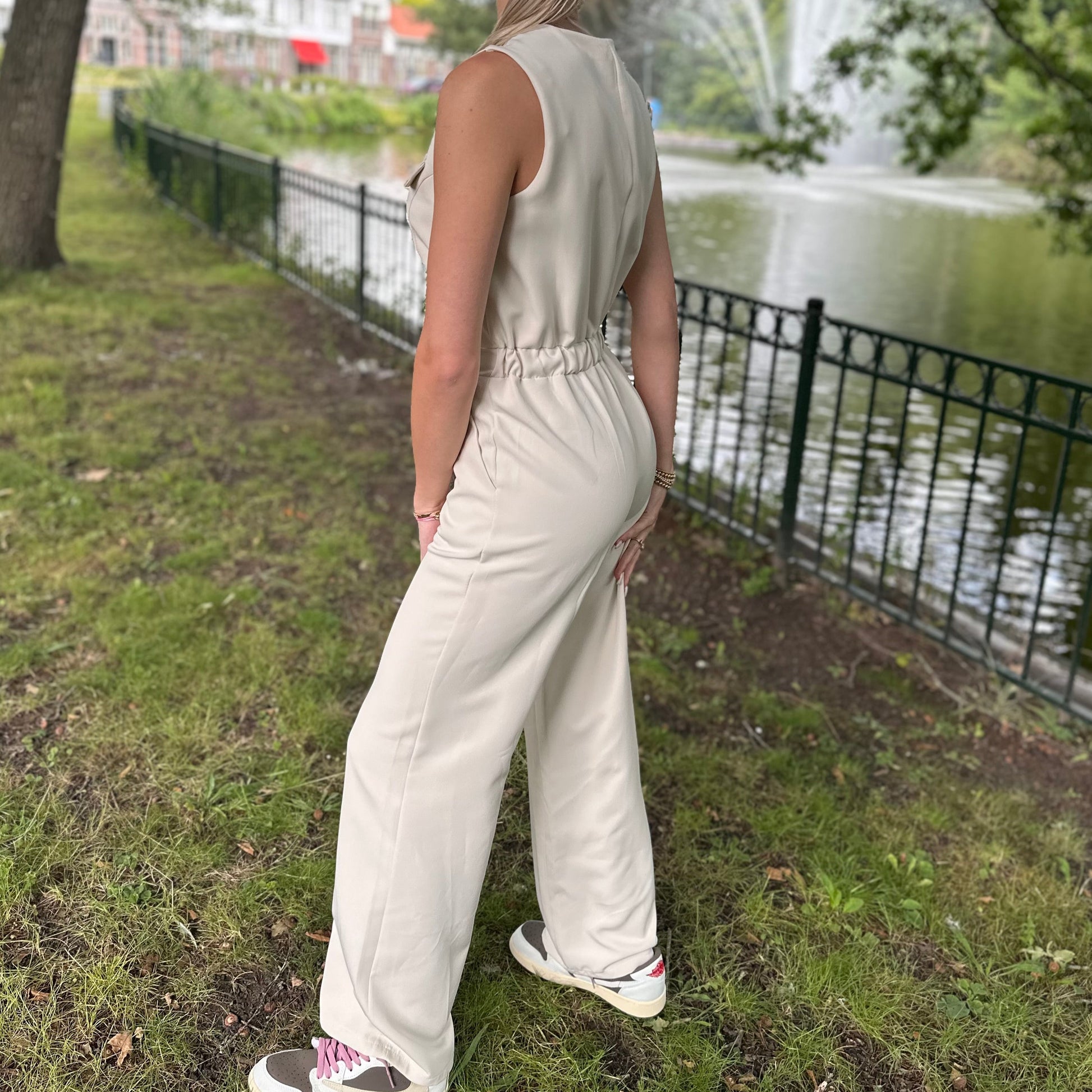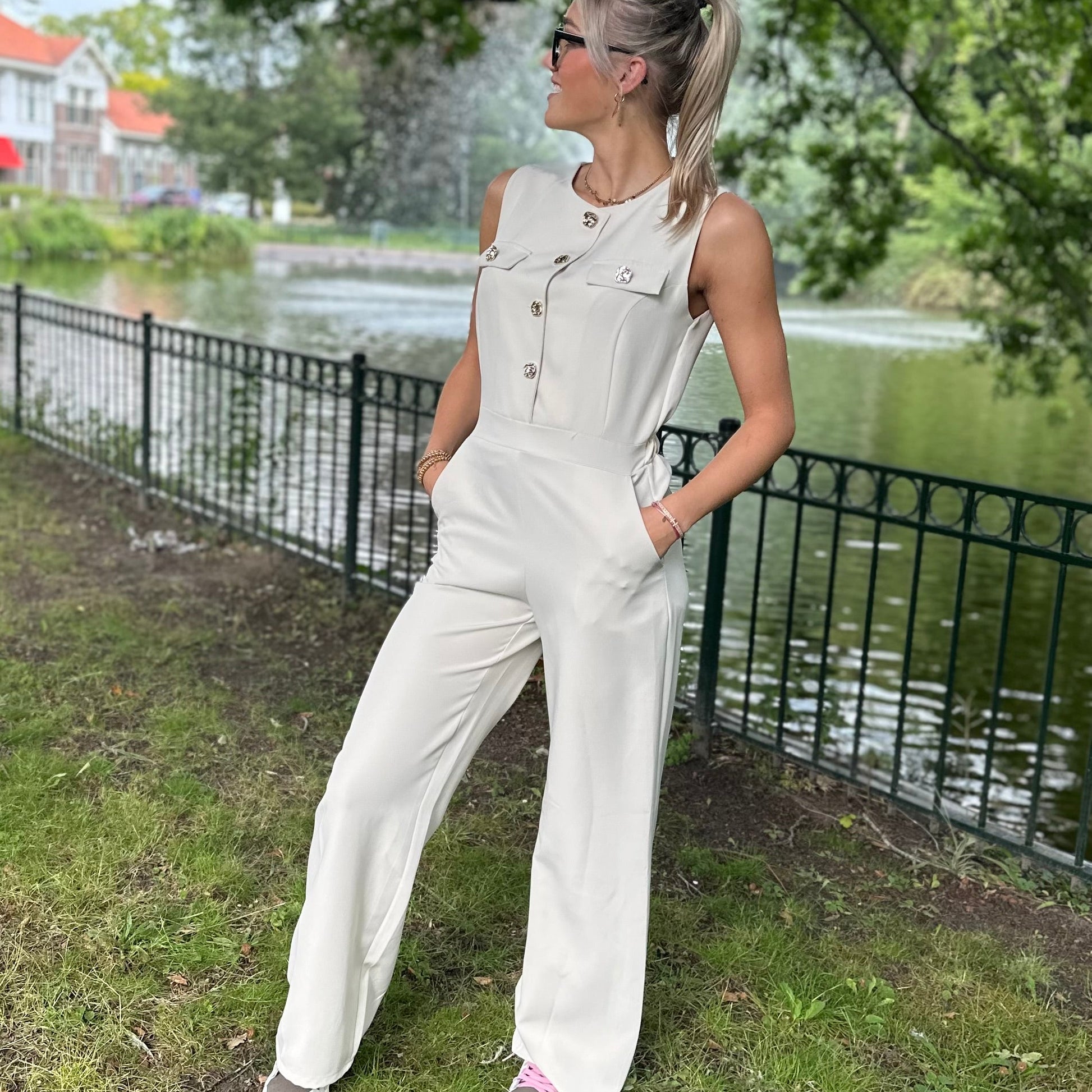 De Sandy jumpsuit is de belichaming van tijdloze elegantie. De zachte crème kleur in combinatie met luxueuze gouden knopen geeft deze look een verfijnde en vrouwelijke touch. De flatterende pasvorm maakt het een veelzijdig stuk voor elke gelegenheid.